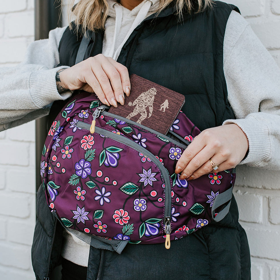 Take on your day with style and ease. Featuring the vibrant Ojibwe Florals design by First Nation artist Storm Angeconeb, this lightweight sling pack blends function and personality.