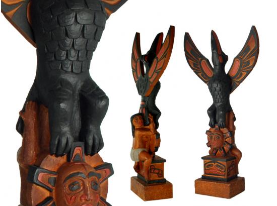 The Northwest Coast Natives have a perception of oneness of all earth's creatures, human and animal. They believe that humans may transform into animals, birds, fish and mythical creatures and back again. Once transformed they take on the essence and spirit of that being, Their art reflects this transformation. This 3-dimentional free form Totem features the Raven stealing Sun story.