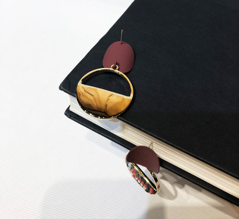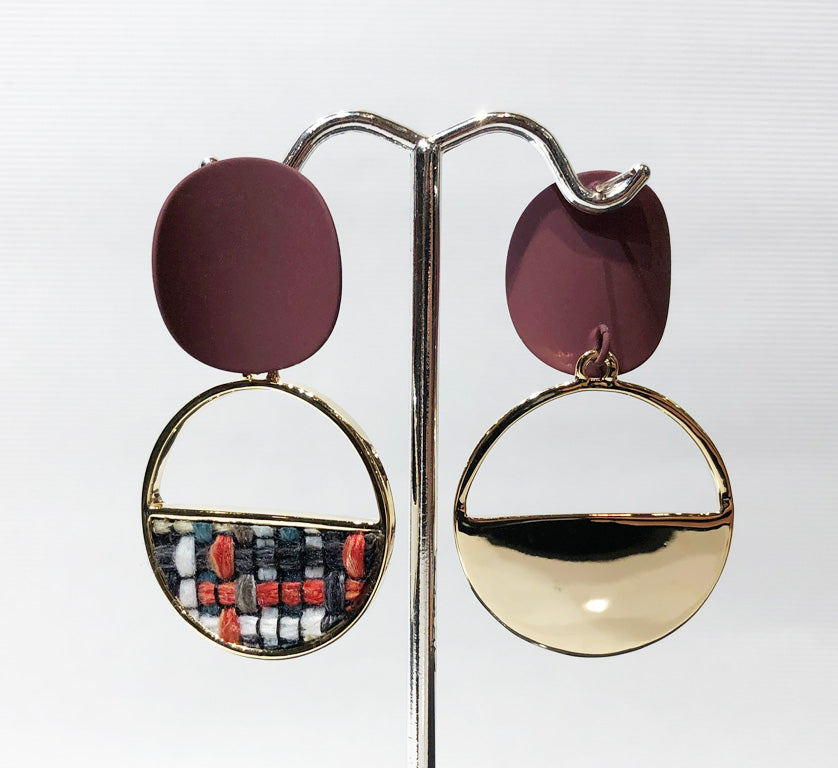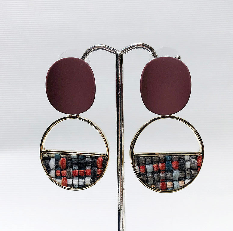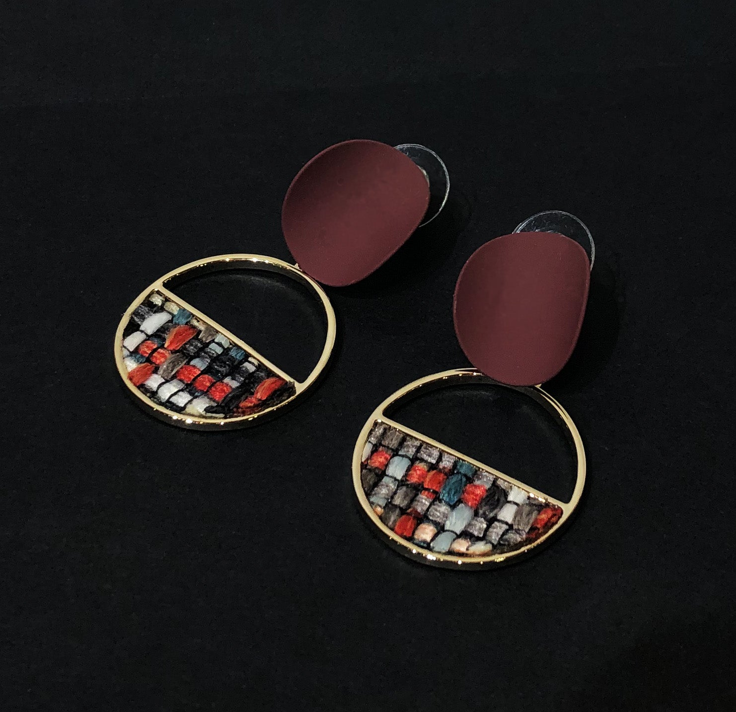Museum style multi-color wool weaving set in burgundy and gold plated drop earrings.