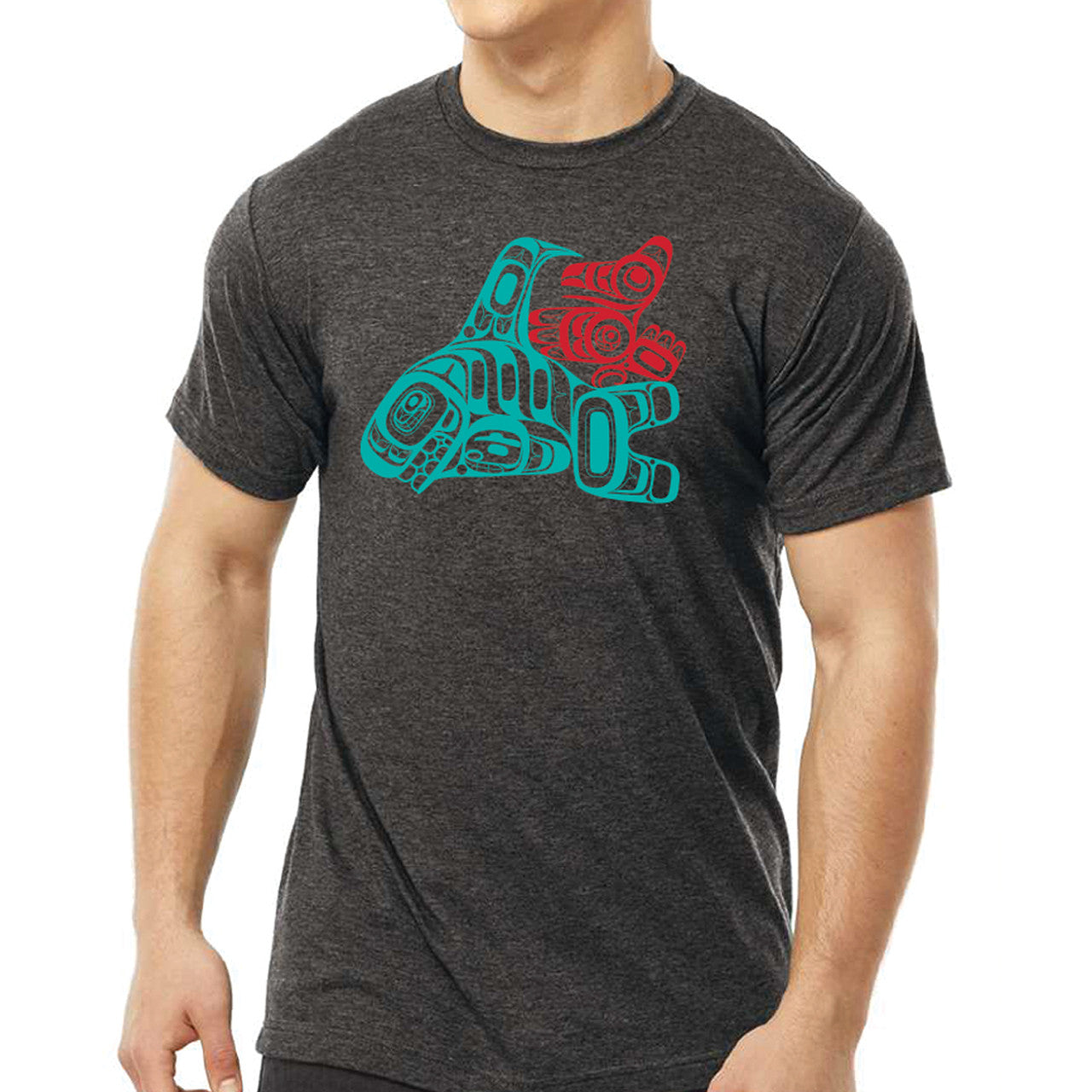 An indulgently soft cotton blend infused crew neck unisex t-shirt features the Indigenous design Whale Rider by Haida artist Gordon White.