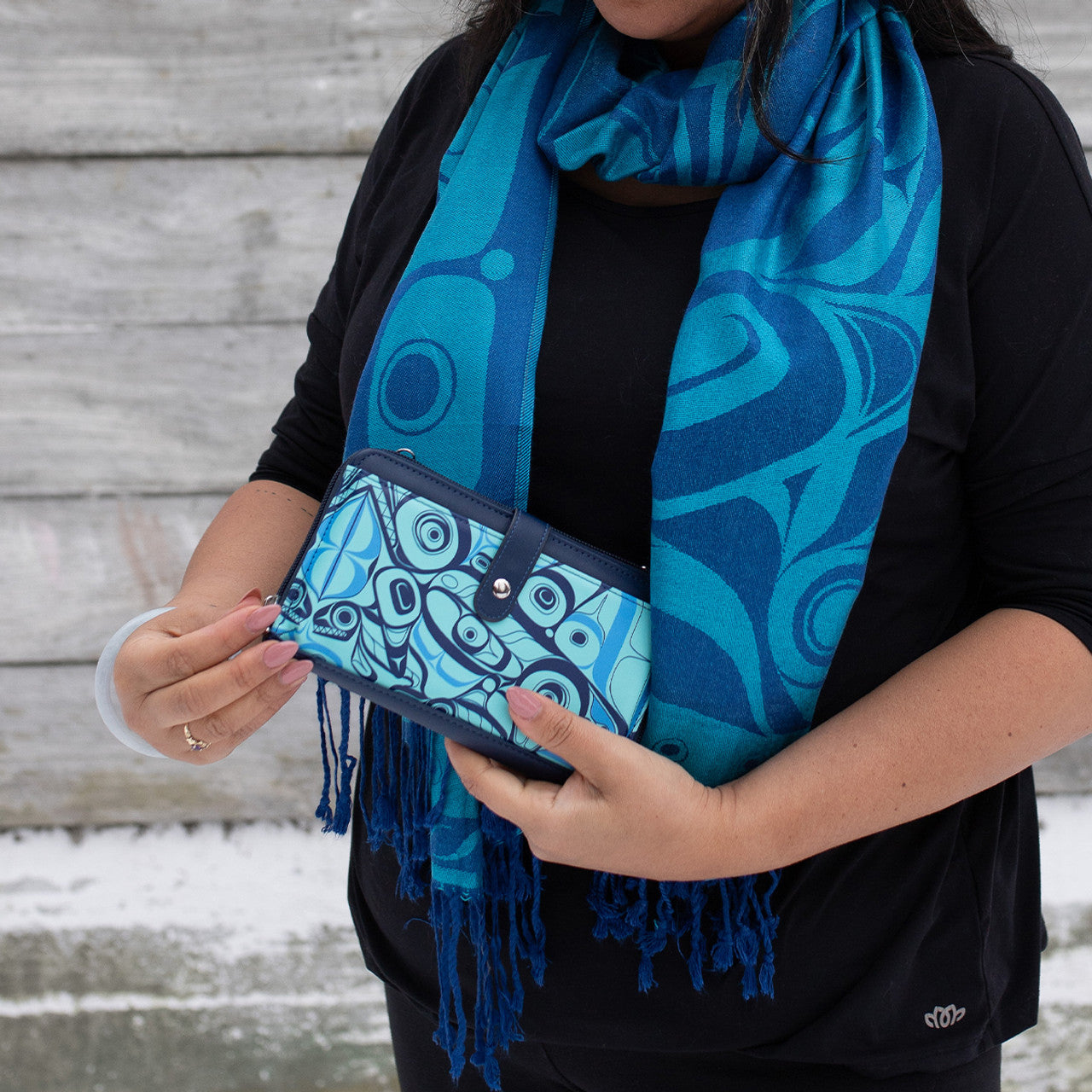 Designed for everyday versatility, this smartphone crossbody bag brings the powerful spirit of the whale to your daily essentials. Featuring original artwork by Morgan Asoyuf, a Tsimshian (Ts’msyen) artist from the Indigenous peoples of the Pacific Northwest.